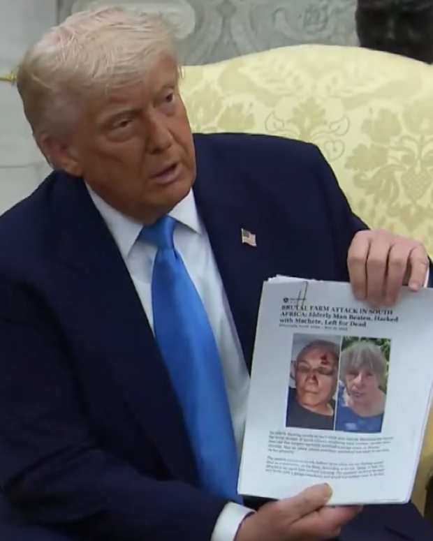 During his meeting, Trump held up Hattingh's Facebook post from a collection of "articles" that Trump shared as part of his larger narrative attempting to legitimize the debunked claim that white South African farmers are being systematically murdered in a state-backed genocide—a conspiracy theory long discredited.